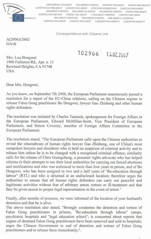 欧洲议会分部主席COUGNON在二月十三日的来信中写道:“经过几个月的努力,我们终于被通知了你丈夫的下落,知道他依然活着。我们强烈谴责将法轮功学员关押到监狱、劳教所、拘留所、和精神病院,并施以酷刑;我们非常关心被关押的法轮功学员器官被摘取卖给医院的有关报告;要求中共立即停止对法轮功学员的关押和酷刑并释放他们。”