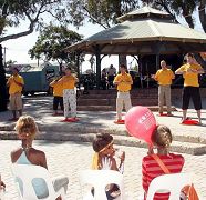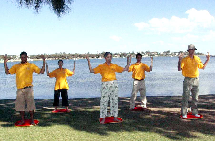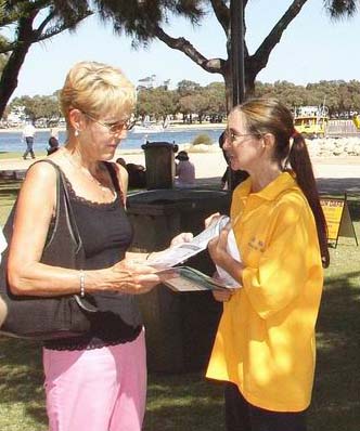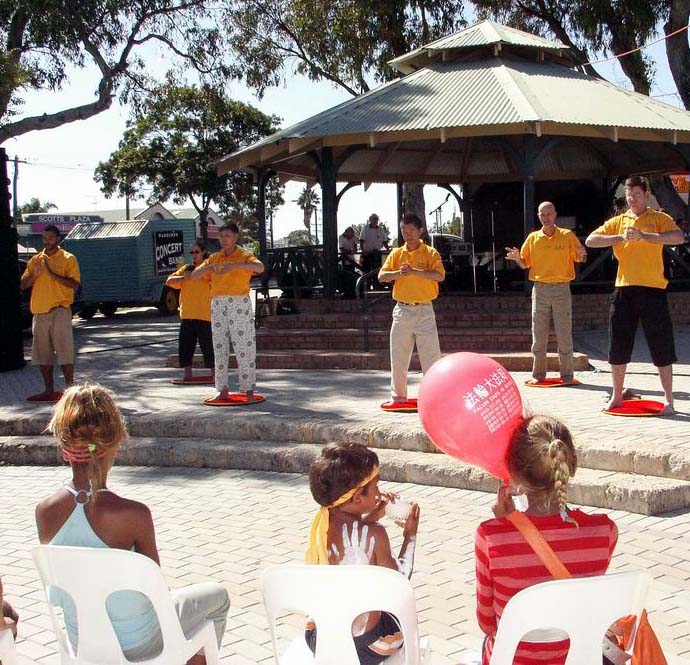 西澳法轮功学员除了上台表演外,并被邀请在海天一色的沿岸示范功法、发传单。在凉爽的树荫下,徐徐的微风伴随着祥和的炼功音乐,人们陆续接到了大法的福音,并知道了正在中国发生的对法轮功修炼者的迫害。