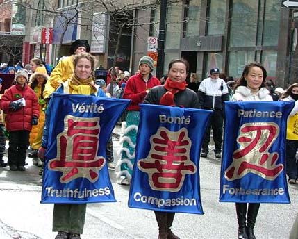 大型横幅清晰的向人们传递着法轮大法的修炼原则“真、善、忍”。“法轮大法好”的歌声从始至终伴随着观看游行队伍的人们,播撒善的信息与美好。狮子舞、传统腰鼓、法轮功的功法演示,为持续了一百八十多年的游行队伍注入了东方的神韵。