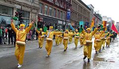 法轮功学员组成的游行队伍,以阵容强大的炼功方队为主,配上狮子舞、腰鼓及花车,格外引人注目,因其色彩明亮,音乐祥和清新,狮子舞、腰鼓与功法展示动静结合、刚柔相济博得了观众的喝彩和掌声,人们由衷的赞叹:非常好(Very Nice)!