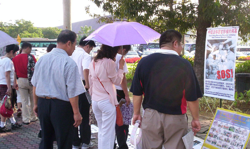 在揭露中共活摘法轮功学员器官等真相展板面前,许多游客愤慨不已,觉的中共比希特勒还要残忍。经过展板前停下观看并了解真相的大马各民族及西人游客,都会签名支持反迫害。一名在景点附近商店工作的年轻女性,不但自己签名,还向法轮功学员要了一张表格要帮助征签,她共征得十余名亲朋好友的签名支持,于第二天上午送回来。