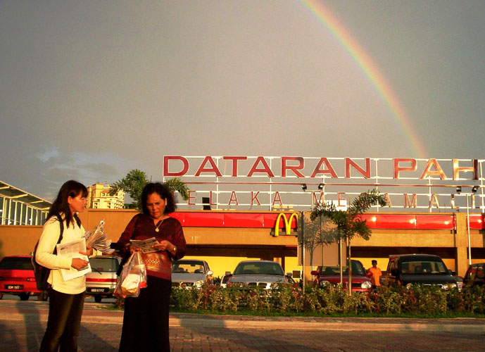 因适逢马六甲举办新春文艺大游行,马来西亚元首受邀前来观赏。当天早上元首也顺道前来景点游览,当他的座车缓缓从法轮功学员们身边经过时,学员向他挥手欢迎,他亦笑着挥手。大法弟子高喊一声:“法轮大法好!”驾驶摩托的警卫微笑点头而过。