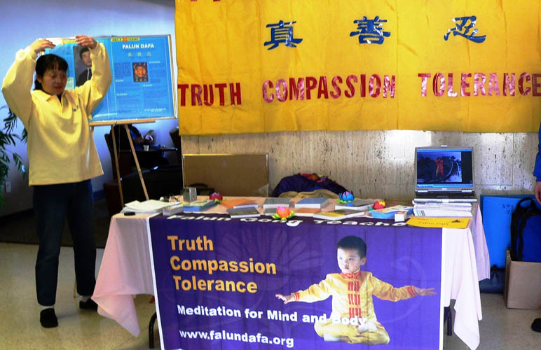 很多光临健康展示会的人们对于礼堂入口处的法轮功展位都留下了深刻的印象。金光闪闪的“法轮大法”横幅以及庄严、慈悲的音乐伴随着人们步入展厅。