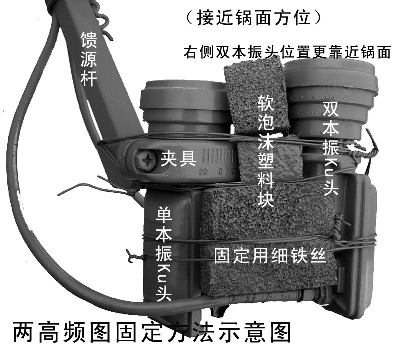 在调整好主收亚太2R卫星节目的基础上,手持双本振Ku高频头在单本振Ku高频头右上方5厘米左右距离晃动,要同时接好电视看信号质量,找到最佳接收位置。新唐人对亚洲信号已经加强,调试时高频头左右晃动5公分都有信号,只是信号强弱不同。经调试得知,最佳的一锅双星偏收W5新唐人的双本振Ku高频头的接收位置为:在主收亚太2R卫星单本振Ku高频头的右上方较靠上的方位,不向以前有同修所说的紧挨着,要相距5公分左右,两高频头平行,但接收新唐人的高频头距离要较主收亚太2R卫星的高频头靠近锅面1—2厘米(见下图)。由于两高频头之间有约5厘米的距离,我是在中间垫了一块软泡沫塑料,用细铁丝绑住固定的。