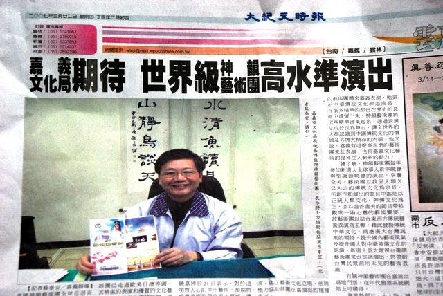 台湾《大纪元时报》三月二十二日报导:台湾嘉义市文化局长饶嘉博表示,能让嘉义人有缘观赏到世界级的表演,站在推广文化艺术的立场,他将极力协助“神韵艺术团”在嘉义演出的种种事宜。饶嘉博兴奋的说:这种启迪人心、源自神州的精致艺术,将会为嘉义乡亲带来很大的震撼,因为中华传统文化源远流长,有很多精华的部份在历史的长河中遗留下来,我看了“神韵艺术团”的简介影片及剧照后,我觉的“神韵艺术团”将这些精华汇集起来,通过表演呈现于世界舞台,让全世界的人都认识到中华传统文化的价值及其博大精深的内涵。他表示,有这么高水准的艺术团体来此表演,将为嘉义市文化艺术的提升注入崭新的动力。