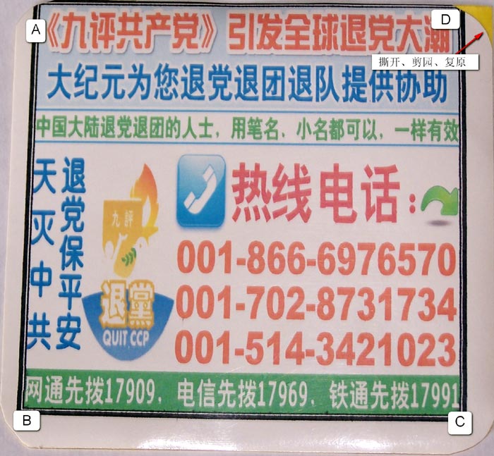 一、 将不干胶的A、B、C三个角,用剪刀剪成圆弧形,以便被人撕去(遭破坏)时不太容易。