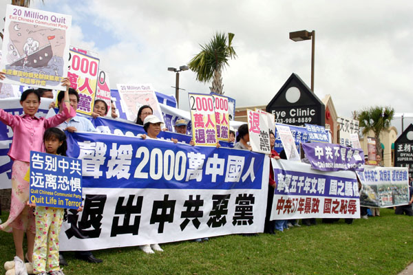 二零零七年三月二十四日至四月八日,由退党服务中心、大纪元时报、希望之声和新唐人电视台举办的“全球声援二千万中国人退出中共”大集会在北美各大城市陆续举行。三月二十四日,活动在休士顿中国城拉开了序幕。法轮功学员也参与了这次集会。
