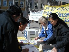 在活动过程中,有一对情侣逗留了将近两小时。女孩来自中国大陆,受中共的毒害颇深,身为德国人的男友直着急,他力劝女孩放弃对法轮功的偏见,希望女孩能和他一道去签名反迫害,女孩就是不答应。男孩苦口婆心的从老子、孔子讲到中共对文化的破坏,希望女孩能了解中共的邪恶。记者见到他们俩时,那男孩正急的直跳脚,问女孩为什么一提到中国的阴暗面就不能接受,就认为是反对中国,为什么、为什么?!