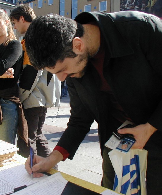 ![]() 学法律的德律力斯来自希腊,他希望通过他的签名制止中共继续杀人 |