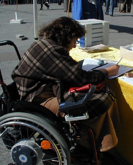 坐在轮椅上的德国妇女很吃力的签下她的名字,她认为这种行为是犯罪(指中共活摘法轮功学员器官),必须制止。她是通过女友得知这一消息的,女友告诉她,最近有一个惊人的丑闻,指的就是这件事。