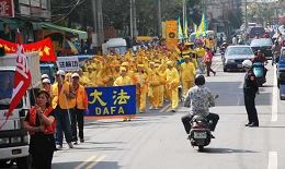 二零零七年三月二十六日早晨,我攀上停在嘉义梅山农会前的一部农用小货车上,从照相机的镜头里,看到远处梅山国小校门口昂首阔步向我这边前进的法轮功腰鼓队,虽然听不见鼓声,在清晨温柔的阳光里,他们黄色的衣衫飘拂在古朴的街道上,让我感觉这是一支壮大的圣旅。