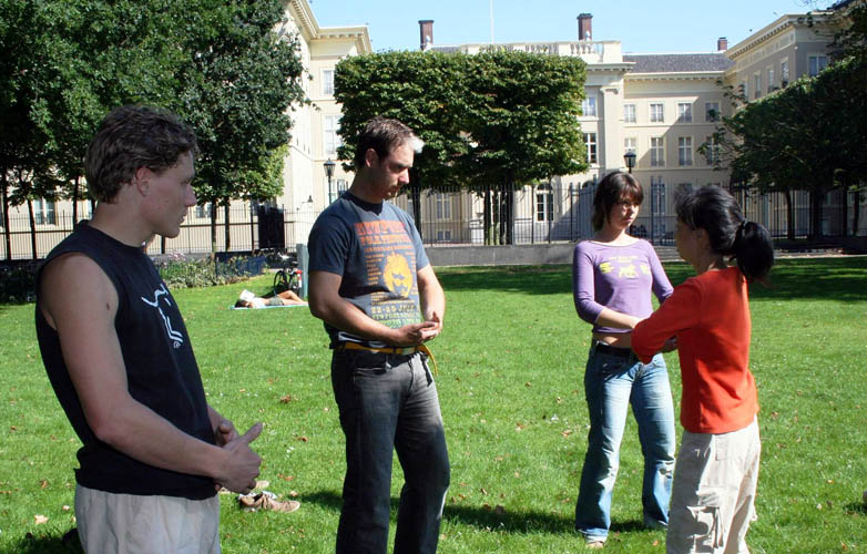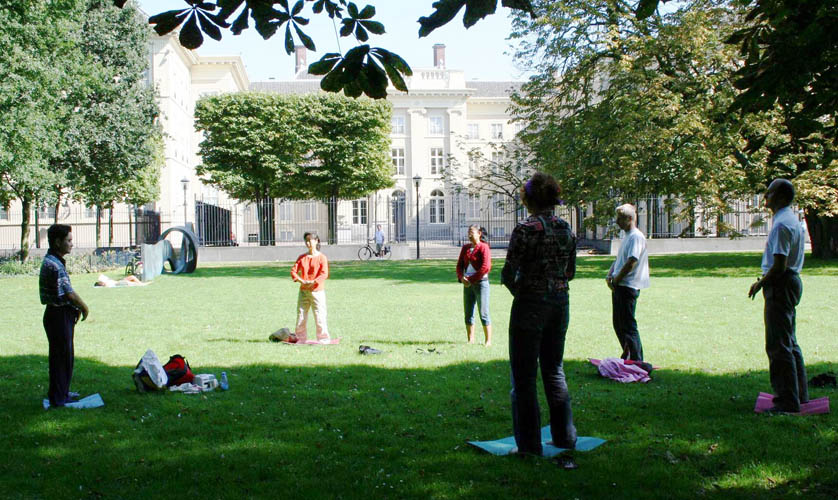 来到炼功地点,是荷兰女王办公楼的对面,我不由的又停下来。舒缓的炼功动作随着他们的手臂飘动,随机而行,缓、慢、圆。他们脸上带着祥和的微笑,使整个炼功场静谧,清新。我被这个景象所感动。不一会儿来了三位年青人,一位法轮功学员微笑着走过去自我介绍,然后开始教他们炼功。三个年青人神情专注的学炼了起来。我悄悄的拿起了相机。他们对我的“打扰”丝毫没有介意,还是那么从容。后来我才知道经常有好奇的游客给他们照相。