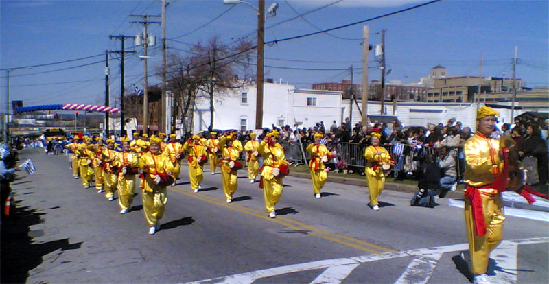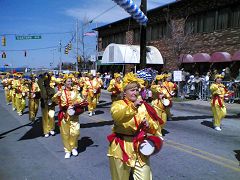 这是当地法轮功学员首次应邀参加希腊社区的游行庆祝活动。由大法弟子组成的腰鼓队和身着色彩亮丽的中国传统服装的仙女队参加了这次游行庆典。