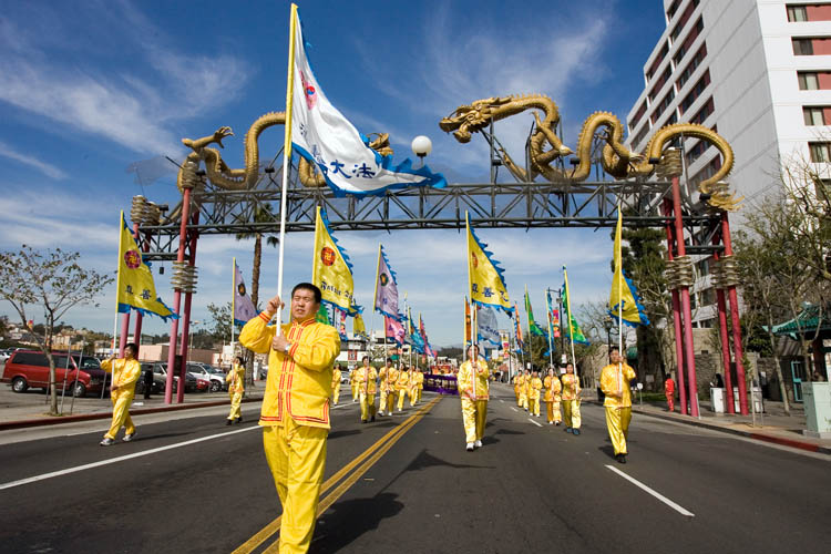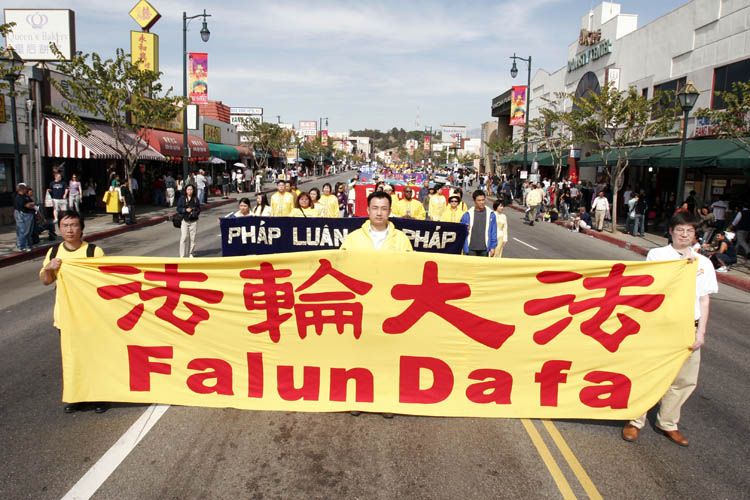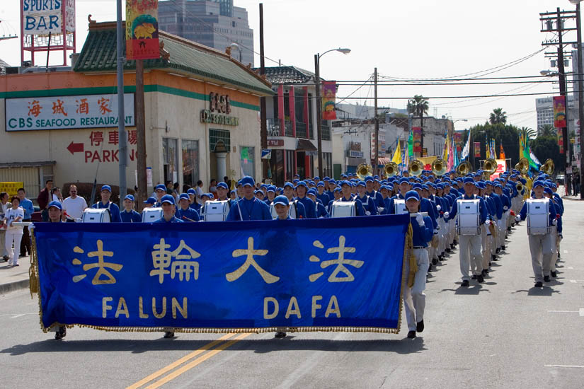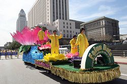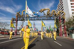 当日洛城风和日丽,游行队伍从市政府大楼前的人权广场出发,沿着洛城主大道(MAIN STREET),穿越中国城。整个游行持续了两个小时,游行主题分三部份,包括大法洪传、反迫害和九评退党队伍。