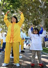 Charles来自纽约长岛,身穿金黄的炼功服,在阳光下显得非常帅气。原来他是一位健身教练,非常喜欢气功,两年半前接触法轮功,他说:“法轮功是最好的,我找到了我想要的。”