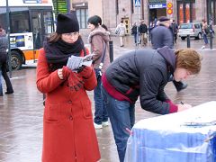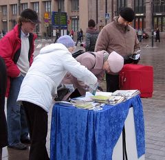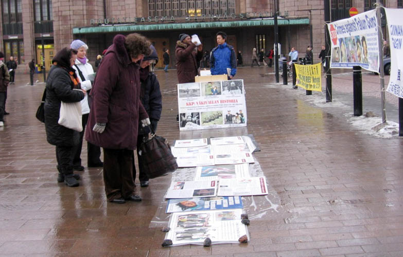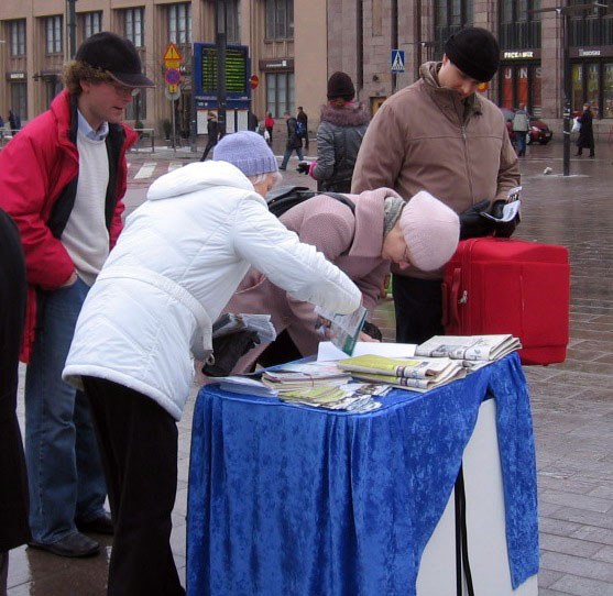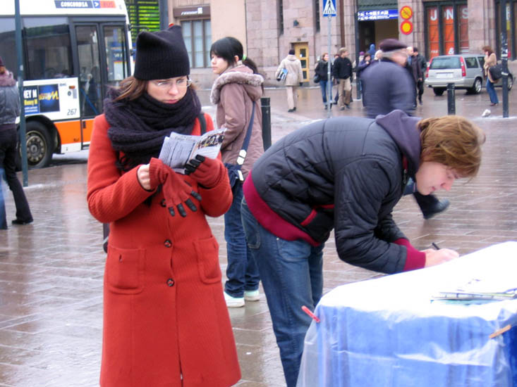 一位芬兰男士问法轮功学员小王,中共为什么迫害法轮功?天安门自焚案是怎么回事?当小王告诉他,天安门自焚案完全是中共编导出的一场特大假案时,他说:太残忍了,你们做的对。然后他仔细地看了展板,接着前去签名声援退出中共邪恶组织。
