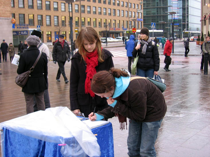 没等“《九评共产党》引爆退党大潮,一千九百万中国人退出中共”的中、英文横幅挂好,已经有人前来签名声援了。一个十七岁的小伙子找到法轮功学员Sinikka建议说:你们应该向芬兰总统和外交部长讲真相,芬兰政府不应在中共对法轮功的迫害一事保持沉默。
