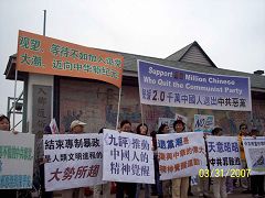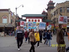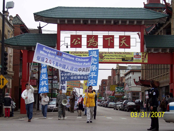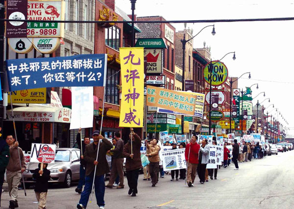 ![]() 在中国城举行的“真相是机缘,退党保平安”主题游行 |