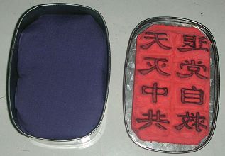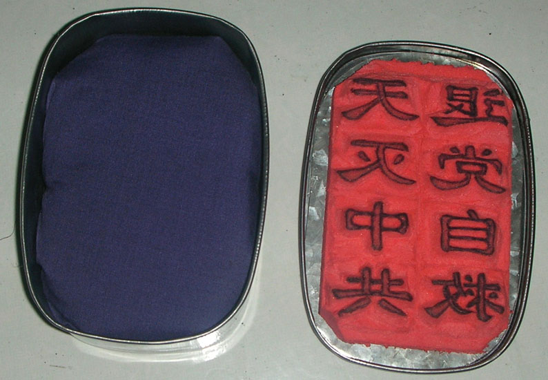 还可以用同样的方法,用那种稍长的饭盒制成“法轮大法好”“真善忍”等单排标语,用红油漆做印油,油漆应适当稀释。这样比喷字方便、快捷、成本低,只要有平面的地方都适用,而墨汁最适合在水泥面上使用。