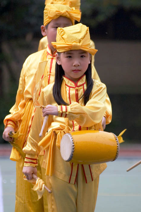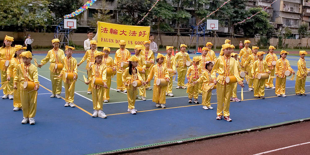 「难能可贵的是,能透过法轮功弟子的介绍,邀请到了明慧学校小弟子的莅临,参与这次的联欢晚会演出,空前的盛况,真是带来了整个晚会欢乐与震撼!当主持人介绍下个节目是来自一群聪明活泼可爱,个个乖巧的明慧小学学生,而且训练有素的小腰鼓队,将带来三段的表演,第一段是……。当小队伍一出场,整齐划一金黄色的队服,及带着腰鼓、小帽,雄赳赳气昂昂!全场不管男女老少,都报与热烈的掌声!紧接着下来,透过音乐的节奏,曼妙的舞步,引起全场的观众肃然起敬,全神贯注欣赏着表演,尤其在现场中,不管男女老少手中的相机更是拍个不停。在一连串的表演场次中,最引人注目的,还是腰鼓队小弟子的表演令人激赏!本人谨代表这次大会,能邀请到明慧学校的腰鼓队引以为荣!希望下次有机会,能再邀请明慧学校的腰鼓队再来表演,最后再次谢谢全体的小腰鼓队及家长们的辛勤协助,谢谢!