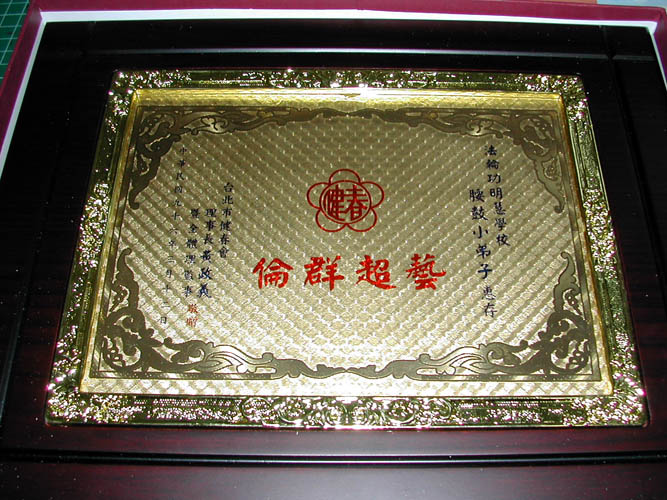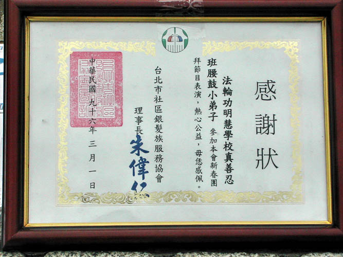 ![]() 台北市银发族协会于小弟子腰鼓演出后致赠的感谢状 |