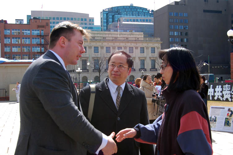 ![]() 在三月三十日“声援退党两千万”集会上,张继延公开宣布脱离中共使馆。 加拿大国会议员罗伯-安德斯(左)同张继延(右)握手表示支持。 |