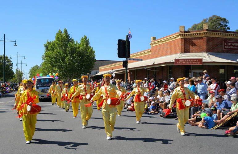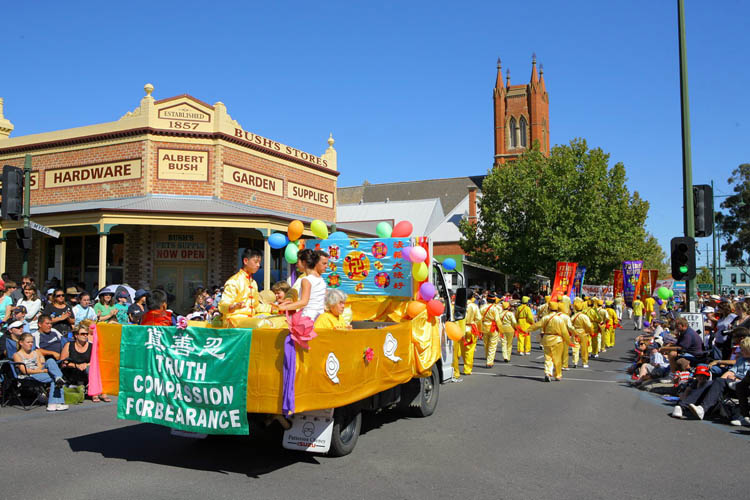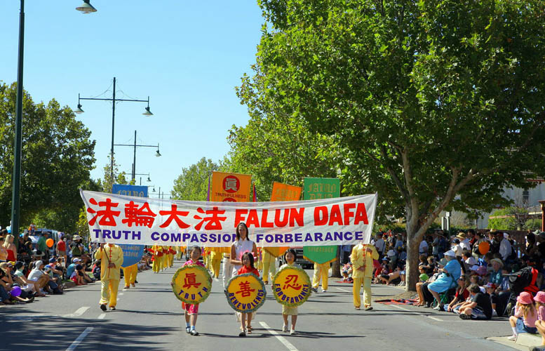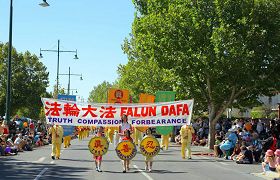 星期一的游行是最盛大的,墨尔本法轮功学员连续六年参加游行,曾经赢得最高奖项,使越来越多的人了解了法轮大法,喜爱法轮大法。今年参加游行的是七十多人的队伍,开头是三个小姑娘手捧着“真、善、忍”三个大字,紧接着是威武的腰鼓阵响彻天宇,随后是优雅的唐装舞、翩跹的彩绸舞和欢快的扇子舞,还有功法表演及莲花彩车,伴随着“法轮大法好”的音乐,整个队伍展现着慈悲与祥和。