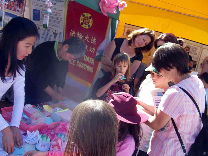 从星期五至星期天,法轮功学员们在摊位上进行功法展示,发放传单,并且教过往的孩子们叠纸莲花。莲花出淤泥而不染,象征坚强和纯洁,当它在孩子们的手中不断传递的时候,预示着邪恶终将被打败,人们互相之间会善良、宽容的对待。