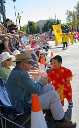 ![]() 两岁多的法轮大法小弟子看到观众这么欢迎,从队伍中走出来与观众握手 |