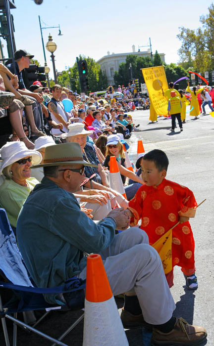 游行历程五公里,沿路的人们不停的为法轮大法队伍鼓掌,不时听到有人在说“法轮大法,太棒了!”还有人说,“你们真漂亮,比去年还好!”队伍中一位两岁多的小法轮功学员看到观众这么欢迎,还从队伍中走出来与观众握手。