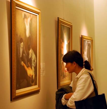 一位在当地朴子国中教授美术的女老师,午休时间无意间走进了美术馆,却被画作吸引住了。当她站在《蒙难在中原》那幅油画前,导览人员为她讲解画中的内涵说:“中共对不愿放弃信仰的法轮功学员,施用一种洗脑的酷刑。这张画里的妻子坐在死去的丈夫身边哭泣,她修炼法轮功的丈夫因为拒绝转化而被虐杀。画家用细腻的笔法烘托出气氛,让人身历其境。”女老师圆睁眼睛用手帕掩着鼻子说:“这幅画把妻子的心情画出来了,这种迫害太可怕了!”