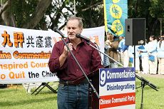 艾德民莱斯中心(ERC)总裁、纽省赴大陆真相调查团团长菲利•戈蓝丹宁(Dr. Phil Glendenning)在集会中表示参加今天这样的集会是希望未来的中国是一个独立强大、尊重人权的中国,可以和世界一起来尊重人们的信仰自由和言论自由。