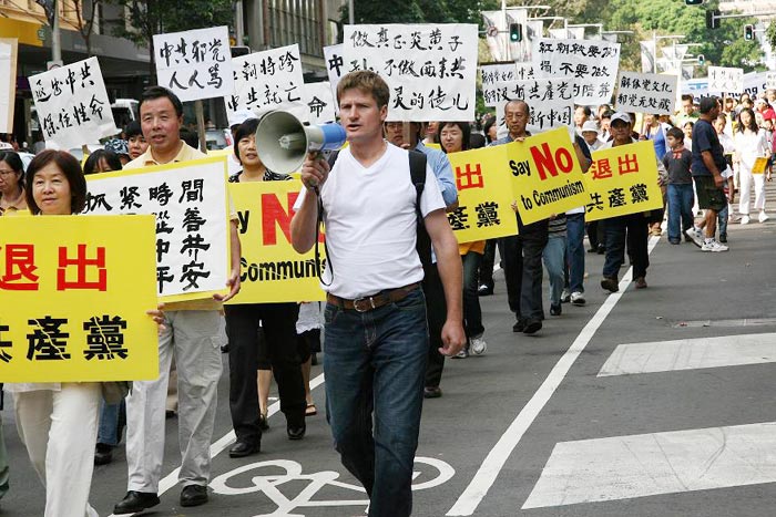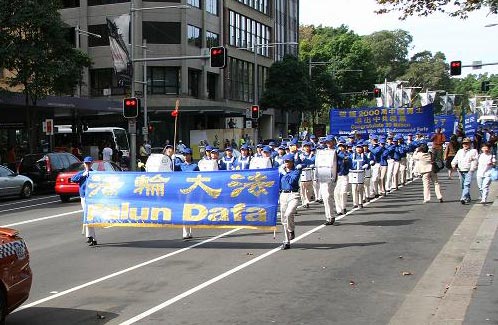 集会后的大游行由警车开道。浩浩荡荡的队伍分成三个方阵,打头阵的是天国乐队,随后是反迫害,最后是各界民众声援退党。队伍从海德公园出发,沿着悉尼市区热闹的大街行进到唐人街结束。
