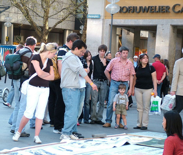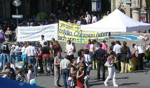 广场的扩音器不断以德文和中文向人们广播《九评共产党》的内容,并揭露中共活体摘取法轮功学员器官贩卖的邪恶。善良的人们纷纷签字谴责中共暴行。越来越多的人们汇入唾弃邪共的大潮,中共邪灵的根都被拔出来了,一个没有中共邪灵的新世纪正一步步的走来。