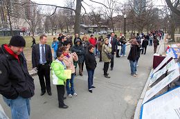 来往行人络绎不绝,或驻足聆听,或观看展板、“真善忍画展”作品,明白了真相的人们纷纷在结束中共党员暴政的呼吁书上签名。有两位民众听完真相,表示要和“中共正解体,你准备好了吗?”的横幅留念,好将退党信息转递出去。
