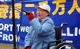 另一现场发言的民众是从日本移民美国三十五年,住在麻州阿灵顿市的滨道子女士(Mich Ko Hama)。滨道子女士两年前中风,行动不便,坐在轮椅上。她在明白了真相后,也在集会上发言表达支持中国人的退党。她情绪非常激动,手拿着麦克风泣不成声。