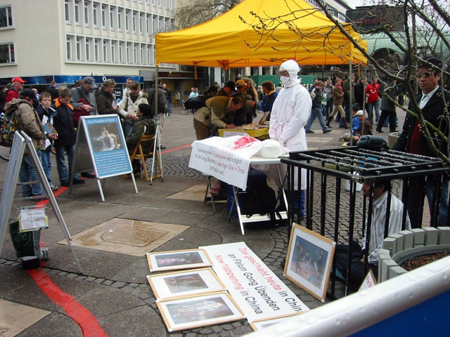 信息台是一个小型的展览,通过图画展现一幕幕场景:例如法轮功学员的器官是怎样被中共盗取的,同时通过一个扩音器还播放着录音的解说。大部份听众都被震惊了。很多人都想做点什么,在给德国政府的呼吁信上签名,制止这场发生在中国的谋杀。想进一步了解情况的人还可以直接和一位在中国劳教所内被关押两年的法轮功学员交谈。