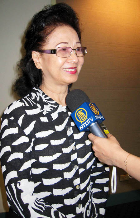 汪女士说,你可以感受得出神韵舞蹈演员下的苦功,他们流露出的自然和喜悦,和大陆那边样板的表演很不一样。她说自己经常去大陆旅游,有非常多机会欣赏到那边的表演,大陆那边给人的感觉是僵硬的,舞者在动作上是整齐划一,但是却没有感情。他们阵仗很大,一出场会让你shock(震惊)住,因为台湾很少有这种阵仗的舞蹈演出。大陆经常用人、大场景来撑托,但你可以感受到那是硬撑出来的,他们就是为了表演而表演,而非从内心里流露出真诚,和这次神韵的演出是完全不一样的。这些有信仰的人所做的表演是大陆那边绝对比不了的。