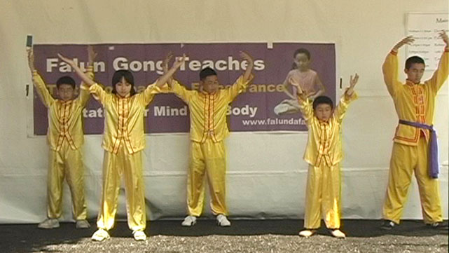 ![]() 明慧学校的小弟子在台上演示法轮功功法 |