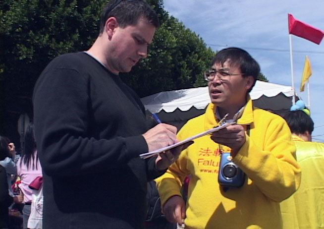 有一家七口人,老老少少主动找到学员要求签名。有一位西方人见到穿炼功服的法轮功学员,问为什么不让法轮功学员参加新年游行,当他知道真相后,告诉学员他知道白兰这个坏人,并说她不只想操控中国城,她还想操控整个旧金山。这位西人还告诉学员说,这里六月份将有摆街会,希望学员继续来这里征集签名,一定会有很多人签名的,因为这是美国,是自由的国家。