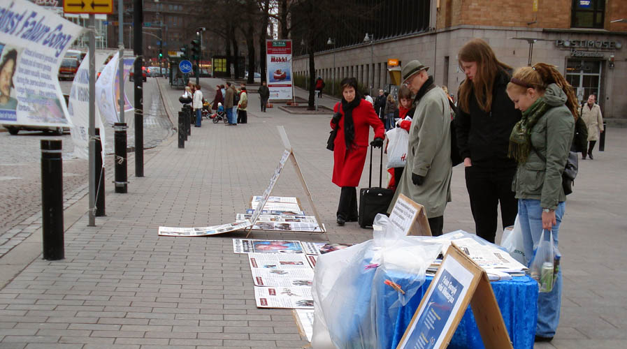 四月的赫尔辛基,冬日的寒气似乎还未完全消退,阴沉的天空不时洒下阵阵牛毛细雨,还夹杂着透骨的寒风。尽管如此,仍有不少过往的行人驻足观看横幅、展板上一幅幅惨不忍睹的图片——中共为逼迫法轮功学员放弃信仰,使用了上百种酷刑。人们被发生在中国的这场迫害的血腥程度所震惊,表现出非常难过的神情。