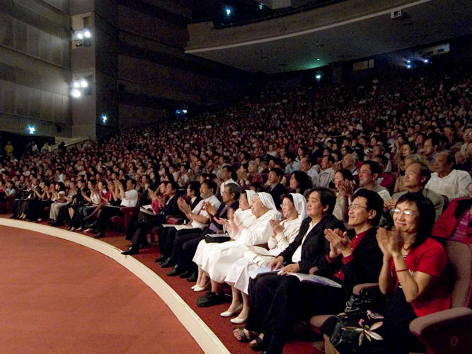 大班的学生啊,现在在外边演出,这一圈巡回下来就是二十多万人。大家想想,这事做的怎么样?(鼓掌)我觉的很划的来。(众笑)所以一个团不够用,两个团、三个团,救度众生嘛。这些大法小弟子不但是在做着救度众生的事,他们也在修炼中提高着自己。他们自己也在成就着自己,他们做这件事情本身也是修炼,也是在走神的路。