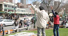 一天,一位白发老者来到了这里,他看完了所有的图片资料又看炼功,久久不愿离去。他说:他住在这附近的楼房里,每周日都感到一种异样的能量吸引着他。他从高楼的平台向下望,感觉到能量是从这个场发出来的,所以特意从公寓的楼上下来,找到了法轮功学员。他要看看是什么特殊的东西,给他造成了这样一个感觉。他拿了所有的资料,还拍了很多照片。