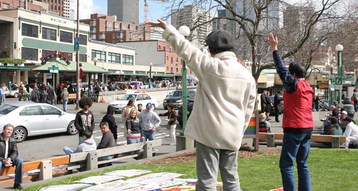 西雅图是一个多雨的城市,整个冬天、春天都是雨季,绵绵细雨下个没完。但是在每个周末十一点至下午三点,学员们在这里洪法的时间里,总是云开雾散。哪怕天气预报有雨,法轮功学员们一到雨也停了。五年来因雨雪而停止炼功洪法的日子寥寥无几。