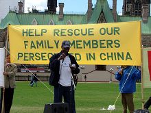 ![]() 加拿大苏丹联盟执行主席Justin Laku在集会上表示支援法轮功的和平抗议 |