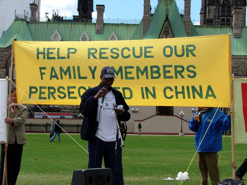 加拿大苏丹联盟执行主席Justin Laku在集会上表示支援法轮功的和平抗议,因为中国政府的群体灭绝和实行种族屠杀的苏丹政府一样。