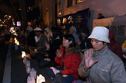 二零零七年四月二十五日晚,美国旧金山法轮功学员在中领馆前举行集会和烛光纪念,回顾法轮功八年来走过的、艰苦卓绝的、和平理性反迫害之路,谴责中共活摘法轮功学员器官、灭绝人性的迫害,悼念成千上万在迫害中失去生命的同修;并呼吁全社会一起维护正义和良知,立即结束中共对法轮功的迫害。
