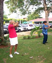 ![]() 巴拿马法轮功学员雷奥纳多•穆斯雷(Leonardo Mosley)在炼法轮功第三套功法贯通两极法。 |