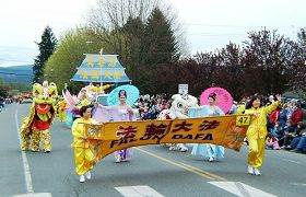 ![]() 法轮功学员多彩的游行队伍深受人们欢迎 |
