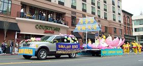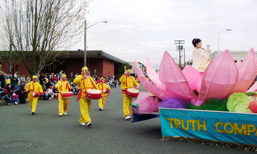 灿烂的水仙花中,却有莲花格外醒目。所到之处,观众掌声不断,孩子们更是欢呼雀跃,喜笑颜开。人群中常常看到人们一边鼓掌一边赞赏的点头;更常常听到喊声“好美啊!”“这是最棒的花车!”“看! 狮子来啦”“中国!”工作人员对法轮功学员们说,“感谢你们来我们的城市!”